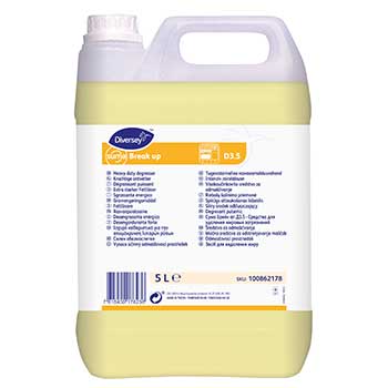 Suma Break up D3.5 é um detergente alcalino líquido adequado para a limpeza manual de todas as superfícies muito sujas da cozinha, como pisos, paredes, equipamentos, exaustores e placas de cozinha.