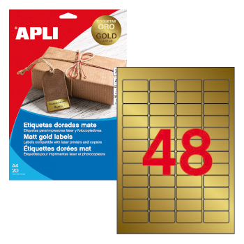 Etiquetas metálicas douradas com cantos arrendondados, tamanho 45,7 x 21,2 mm com adesivo permanente.