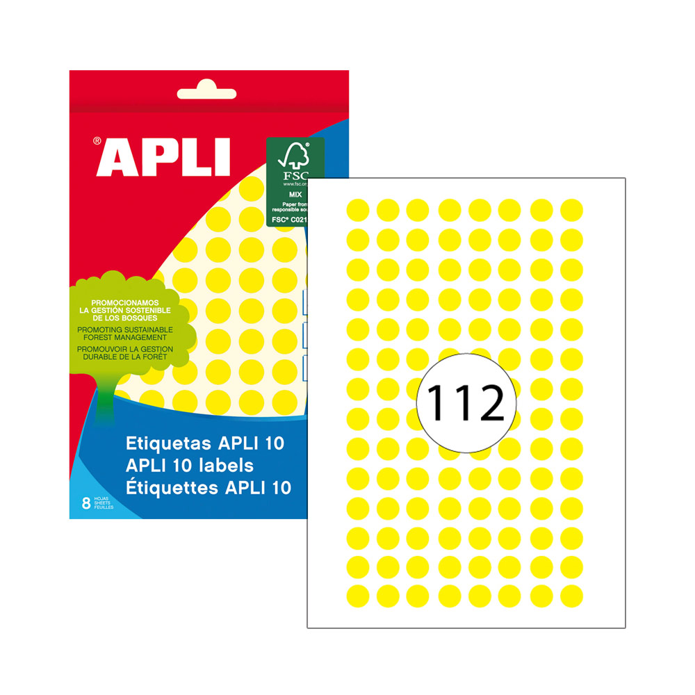 Etiquetas amarelas circulares formato 10 APLI, tamanho Ø 10 mm com adesivo permanente.
