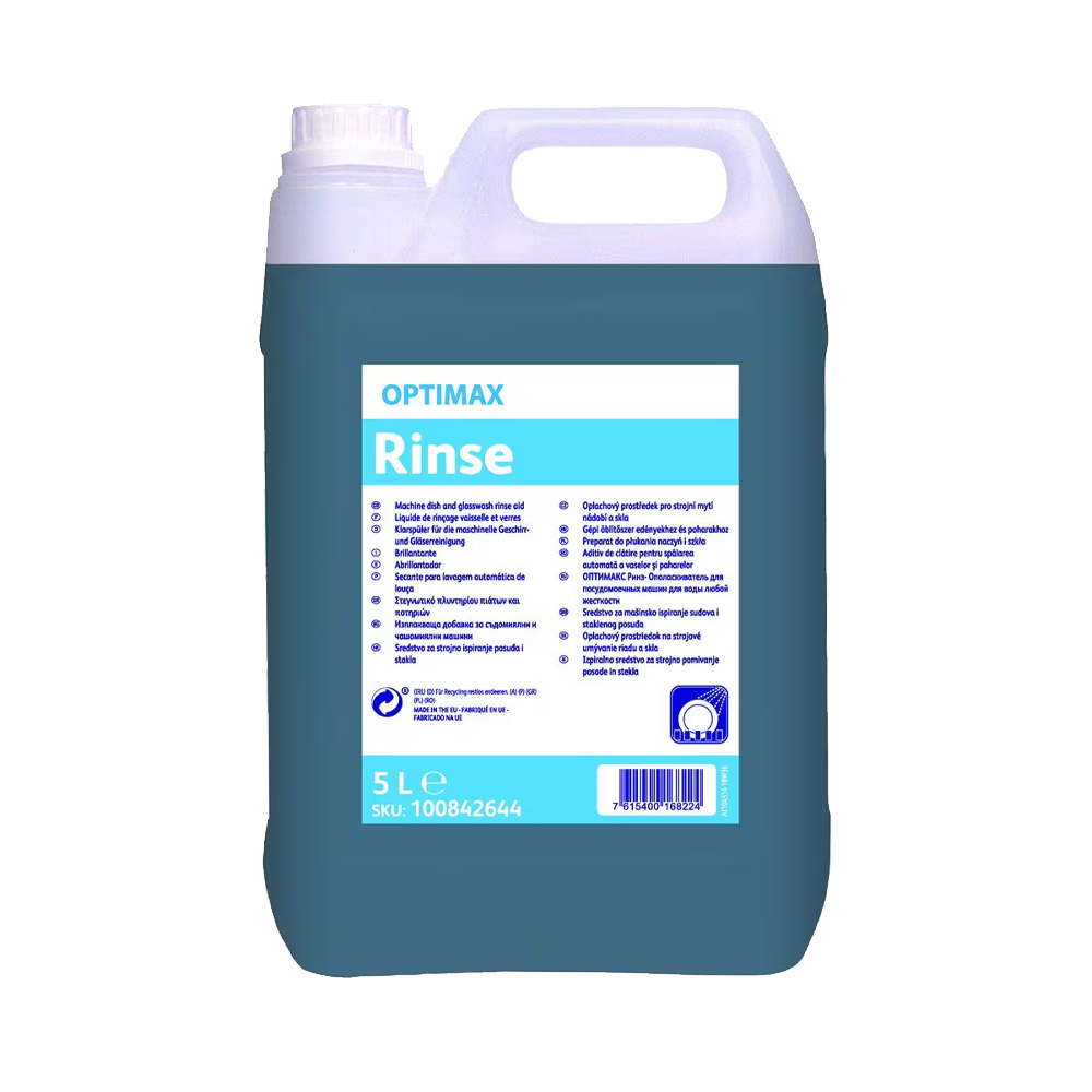 OPTIMAX Rinse é um secante neutro líquido para lavagem automática de louça, indicado para condições de águas macias a médias.