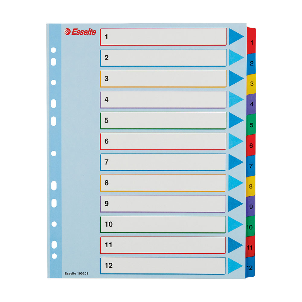 12 separadores coloridos impressos 1-12 para facilitar a classificação.